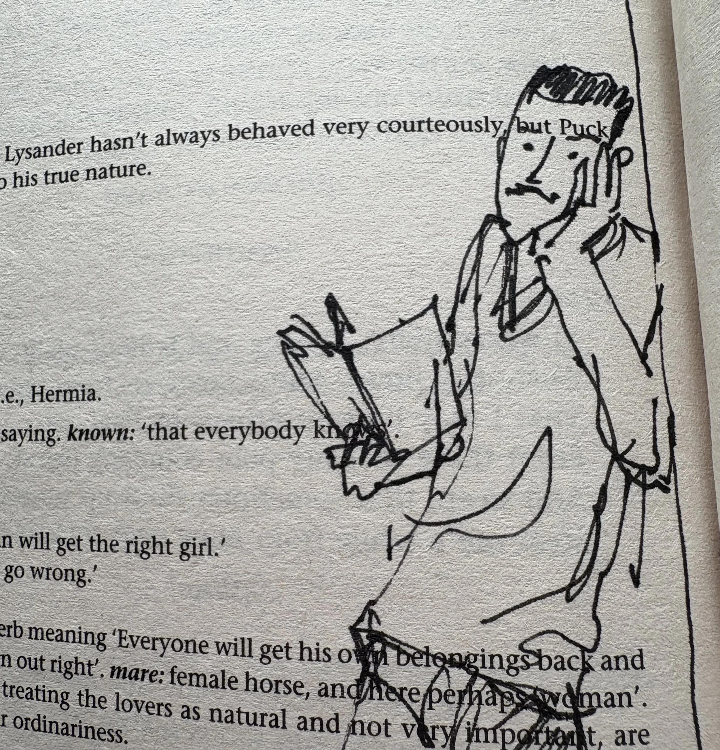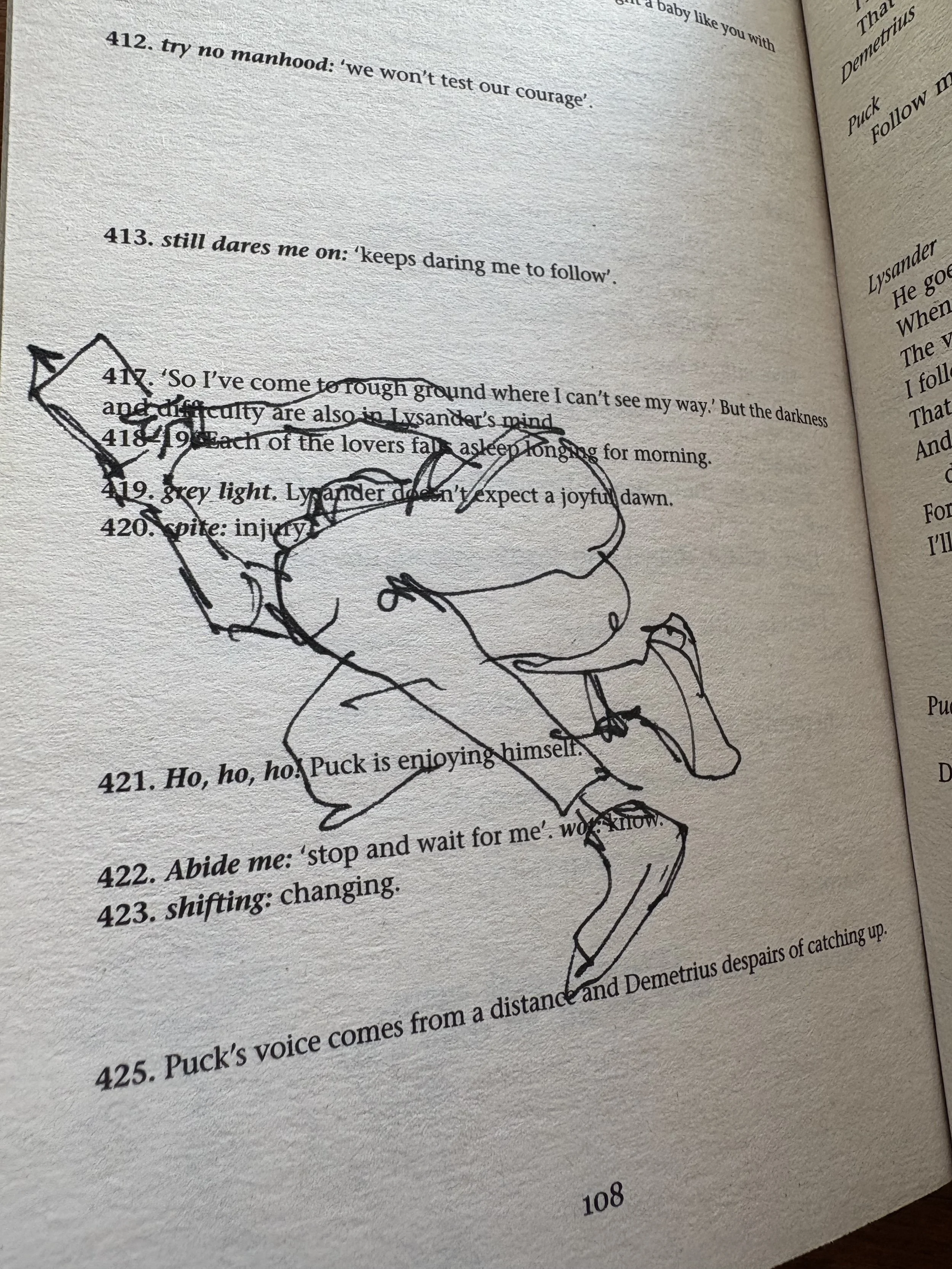 Creating light and shade is possible even without dialogue. Some actions attract, others keep people at a distance. Both can work at different moments. A quiet presence can resonate without pulling focus. Starveling counter-balances Bottom. Perhaps that’s it, like the Moon he reflects light onto other characters and places. He is re-directive, like a good illustration, loosely sketched.